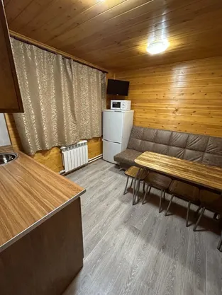 - Кухня: Диван, холодильник, электрочайник, микроволновая печь, посуда, стол, стулья, телевизор, индукционная однокомфорочная плита.
