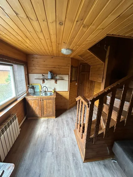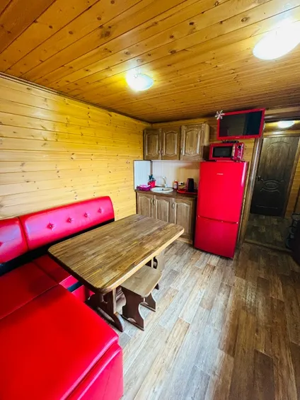 ☑ Кухня: диван (не раскладывается) ,холодильник, электрочайник, СВЧ-печь, посуда, стол, стулья, телевизор, электроплита2 этаж: